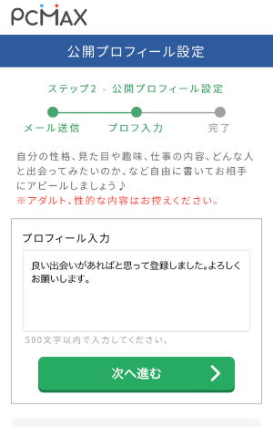 PCMAXで表示するプロフィールを入力します。
